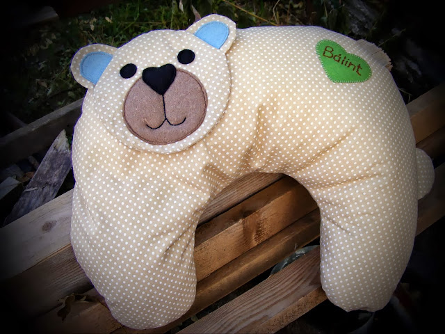 | Vidám, pöttyös anyagból készítettem a maci párnát. |