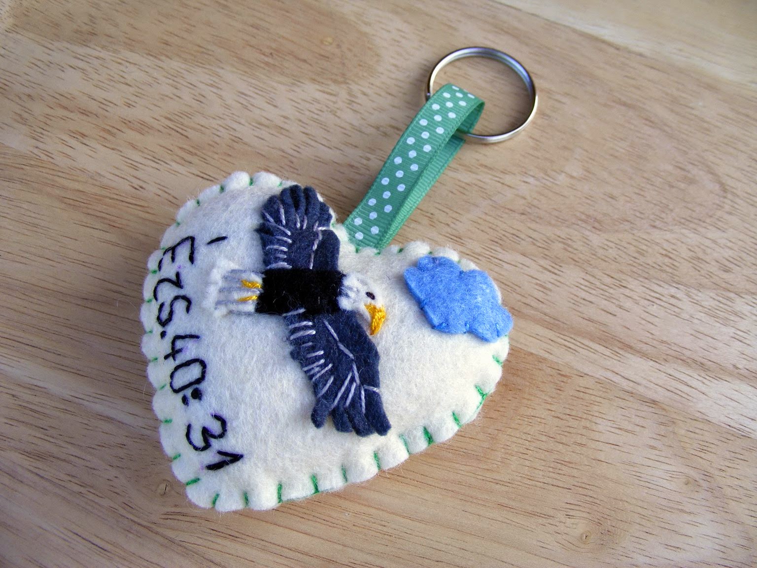 A szív egyik oldalára sast és egy bibliai idézetet kellett varrnom, a másik oldalára pedig az ifjú pár keresztneveinek kezdőbetűire utalva a z M&M's feliratot és cukorkákat.